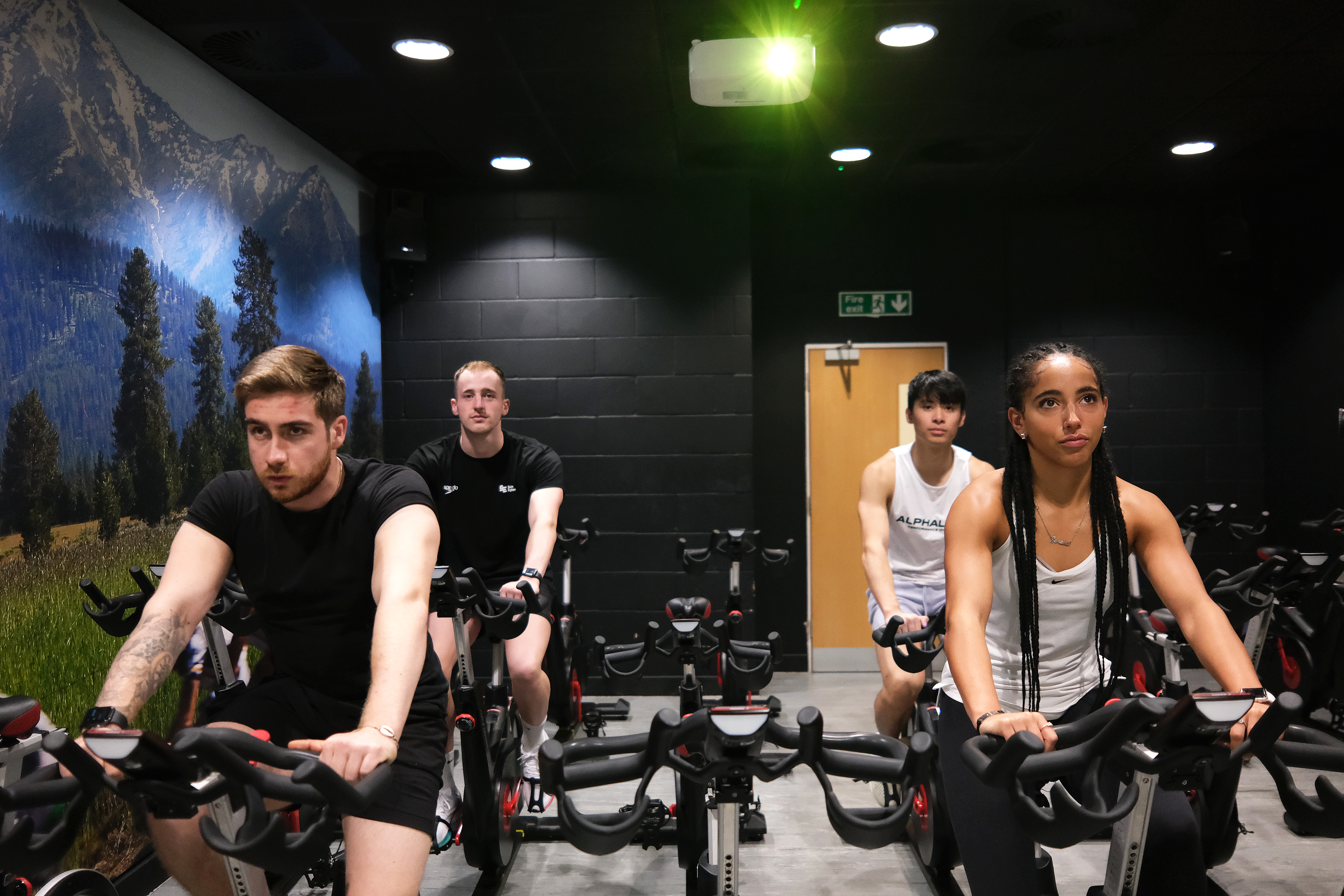 indoor cycling class people cycling watching a screen