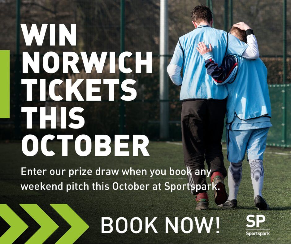 This October, Sportspark is giving you the chance to swap your boots for a seat at Carrow Road! Every weekend pitch booking between 1โ31 October automatically enters you into our prize draw to win Norwich City Football Club tickets. The more bookings you make, the greater your chances of winning.